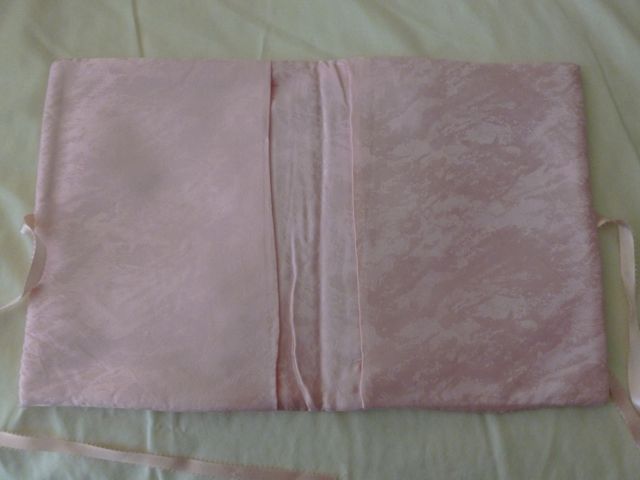 Hanger cover – Make a pattern using the hanger. Cut out four pieces, and batting. Embroider one or both outer pieces with a name, initials, or a motif. Sew two together along top edge leaving an opening in the very middle of the top (for the hanger) and the bottom edge open. Repeat for lining. Place wrong sides together and stitch bottom and hanger opening incorporating piping, lace trim or ruffle. If you want, you can add a zippered pocket to the inside or a Velcro closure to hide jewelry in for trips.