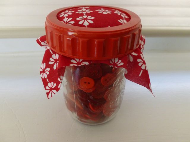 Embroider a small circle of fabric, and use as a jelly jar insert. Or just use a scrap of fabric. Fill jar with fruit butter, hot tea, coffee or chocolate mix, potato soup mix, or bean soup mix. Give the jar with instructions on how much mix to use for a nice cup of tea, or a pot of soup. One of these with a pretty coffee cup or soup mug is a wonderful gift. Or, put them together in a basket with a bread cover to match the jar lid for a more elaborate gift. These jars also make nice decorative items for your sewing room.