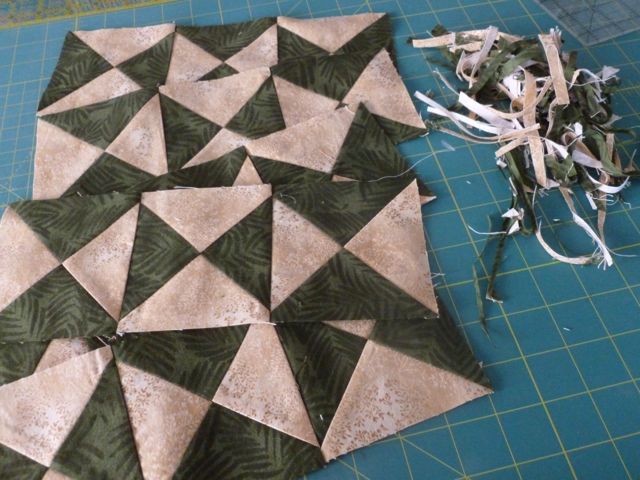 I carefully pressed them, seams opposing, so I could nest the seams. I assembled two mini-quits, identical in size. Note that they both have nice straight sides now. This will be important later.