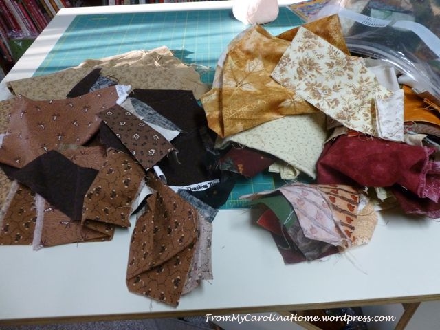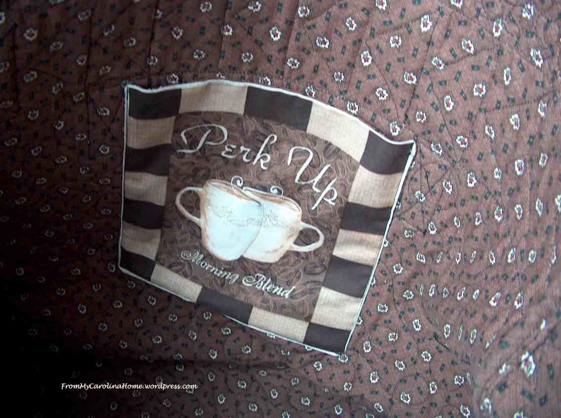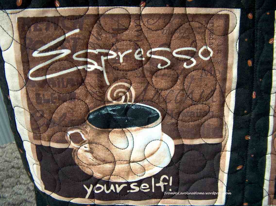 I was in a cute quilt shop while on my last vacation, and found an adorable coffee motif panel. It had six little mug rug size motifs. I had to have it along with a yard of the coffee bean fabric that went with it. Getting home, I pulled out my coffee color stash to see what might go, I wanted it to be bigger than the panel would make, because a few mug rugs weren’t going to be enough for a bag. So, I dug out some fabrics to play with.