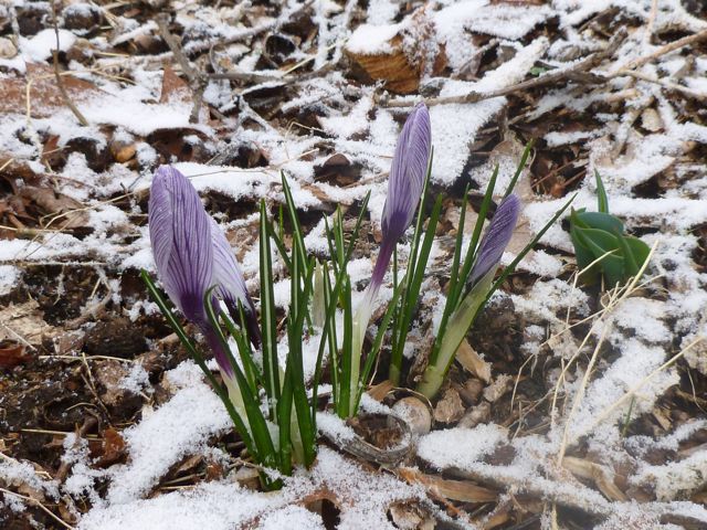 As I backed down our steep driveway to the circle, I found two more delights. The tulips I planted last fall are peeking up. And a little crocus I didn’t know was there was almost in full bloom below the big oak tree in our front yard. Both were outlined in that powdery snow.