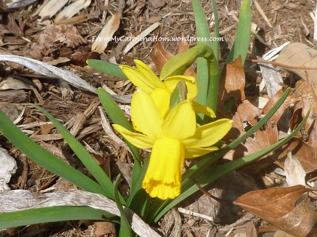 Up near the house, two tiny jonquil blossoms are showing their faces.