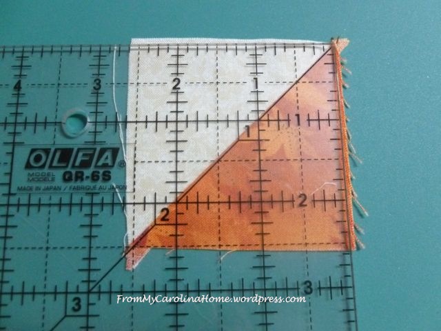 Turn it around and line up the cut edges with your finished size, be sure your diagonal is across the center, then cut off the excess of the remaining two sides