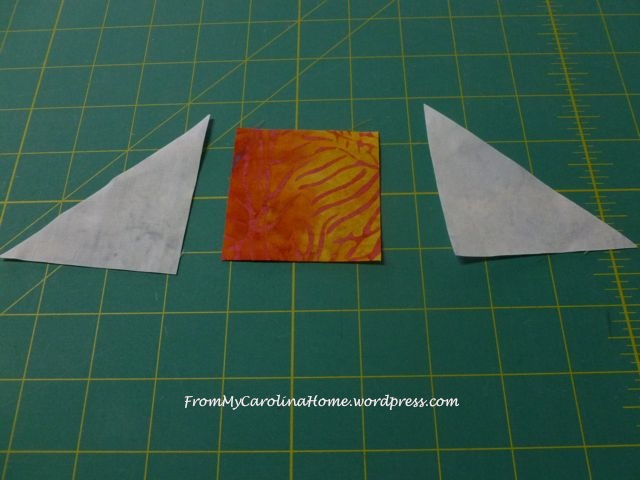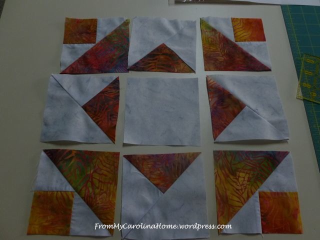 Lay out your squares with their HSTs being careful with the placement of the short edges against the squares. There is only one way it works.