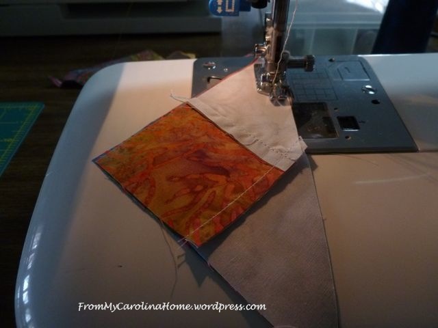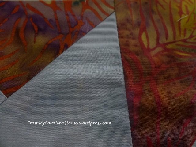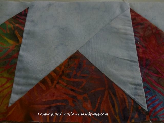 Once again, I am not happy with the overall appearance of this block due to the puckers in the gray. This time I took the suggestions sent to me, but the puckers remain. This fabric is stiff, difficult to put a pin in, and just gave me trouble. I used a lot of steam to try to shrink the batiks a bit. Then I used some Best Press, but I am still getting those puckers. This block has a lot of bias edges, and I found that these fabrics are more prone to stretching on the bias than other cottons. Once stretched out of shape, batik tends to stay out of shape, and is difficult to get back square.