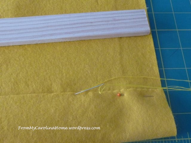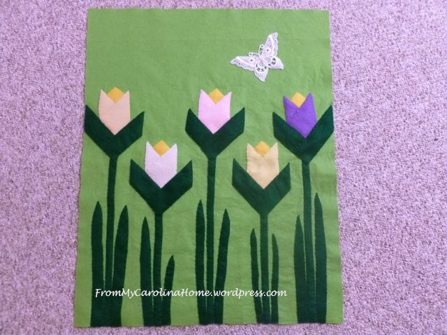 The spring green base is felt 20 inches by 25 inches. I cut flower stems about 3/8-1/2 inch wide, three at 12 inches long and two at 8 inches long. I started by fusing the stems down with ribbon fusible web, then sewed the stems to the light green background.