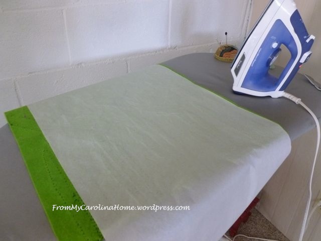 When the stitching was completed, I put fusible web on the back to hold the stitching, and to give the project more body for hanging. My project was larger than the width, so I fold up the edge to fuse an extra piece, overlapping the two.
