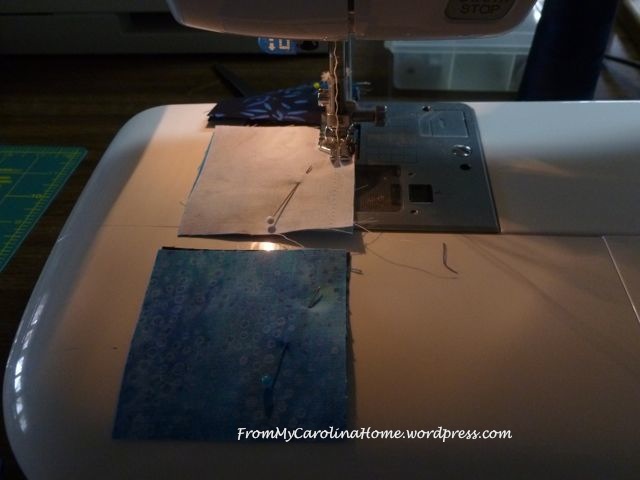 My kit only contained this blue and light gray, but the block image on our handout looked like only two colors so I went on with it. Here’s me Best Pressing those little devils, and then sewing squares into HSTs.