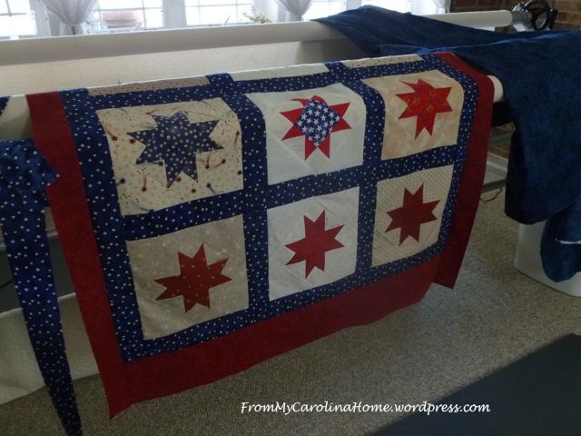 Wednesday was spent working on Quilts of Valor. I had one group of stars that I put together at a work party with dark blue sashing, and I decided to add a red border. The quilt was square, so I made the end borders just a smidgen bigger than the sides so it would work for a wheelchair lap quilt.