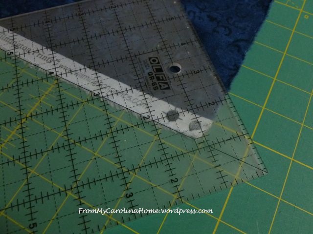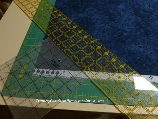 But, most of the time I don’t have a huge piece of fabric to cut. So, I figured out that I already had the tools to make a bias strip with my square-up ruler. Place the diagonal line on your square ruler on the selvedge edge. The edge of the ruler is now at a 45 degree angle across your fabric. Place your long cutting ruler against the edge of the square ruler and cut.