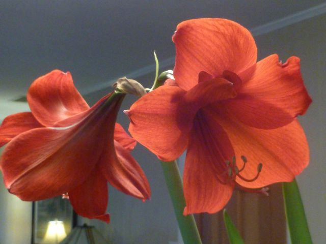 In that silver pot, my amaryllis is putting up yet another leaf. It has already bloomed twice, once at Christmas (picture on the left), and again in February (picture on the right). My dear sweet MIL gave it to me. She knows how much I love flowers.