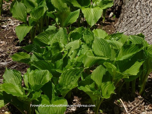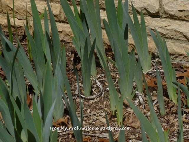 Back in the garden, the irises on the left and the hostas on the right are putting up leaves for blooming later.