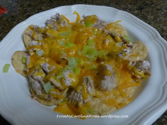 This is the kind of recipe with a lot of leeway, more onion, less cheese, more sour cream, different spices, different kind of chips, add salsa, what ever you like. Microwave for 30 seconds to one minute until the cheese is melted and the pork is hot.