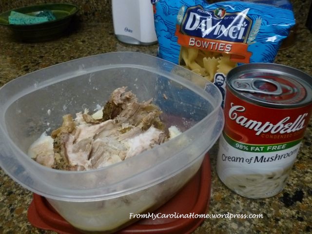 I like farfalle otherwise known as bowtie pasta, but you can use any kind of pasta you like. Chop up one and a half cups of leftover pork. Boil pasta and drain, add a few ingredients, heat through and serve! Dinner in under 30 minutes.