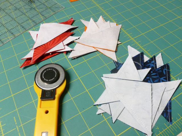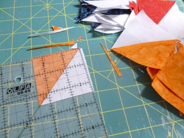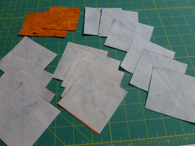 Once again, I do not like the strip method of sewing HSTs, it is too much start and stop, turn the fabric this way and that. So, ignore the cutting directions and cut these – 2-1/2 squares, four of orange, and four of white. Cut 2-7/8 inch squares in the following quantities – 4 red, 4 orange, 6 blue, and 14 white/grey. Pair up the white/grey with each of the 2-7/8″ colors. Mark your diagonal lines like we have done before. Sew the HSTs.