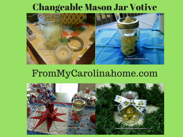 Purely by accident one day while shopping at a big box crafting store, I found that the little flared votive candle holders will fit the top of a medium size mason jar. The votives were just around the corner from the jars, and on an impulse I decided to see if one would fit. You do need the flared top ones, the straight ones aren’t wide enough at the top to stay in place. This opened up a wealth of possibilities for all kinds of themes and choices for what to put in the space at the bottom of the jar.
