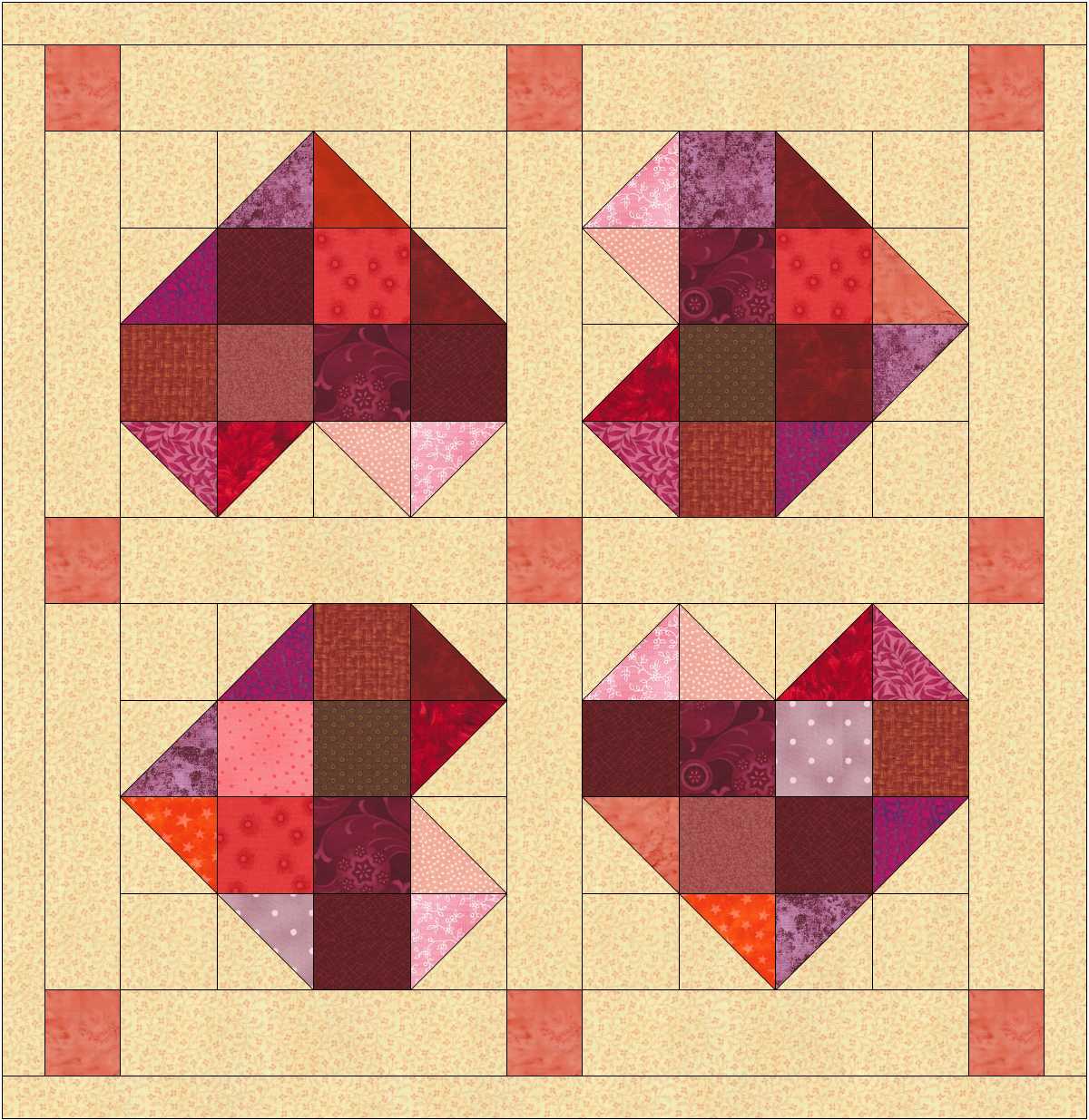 Repeat for the next three blocks. The hearts should measure 8-1/2 inches square. Lay out the blocks with the hearts facing all four directions. Here’s the layout.
