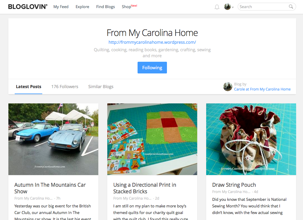 Do you use Bloglovin to follow From My Carolina Home? If so, please make sure you are actually following my blog and not me personally. I do not know how readers find this Bloglovin page instead of my blog page, but I have 197 followers on my personal profile account, which I rarely post to. I have 176 followers for the blog. This means 21 of you are not getting my blog posts because you followed me and not my blog. Recently, I have had notices of four more followers to the profile page and not the blog. Here’s how to check – sign into Bloglovin’, then go to this link – https://www.bloglovin.com/blogs/from-my-carolina-home-11659021 – and be sure it says ‘following’. Below is a screen shot of my blog page prior to this post.