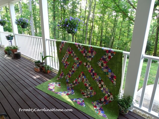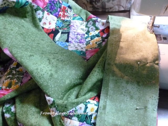After looking at the pieced Quickstep Garden Maze top for a bit, I considered adding a border of brown or looking for a rock or stone print to mimic a stone wall around the garden. Ultimately, I decided it would look best with borders of the same green. So I added those using the proper border technique (see my quilt borders tutorial for details).