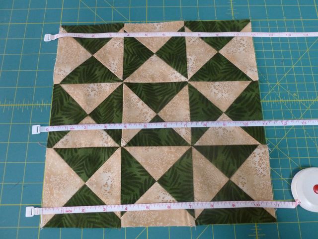 Recently, I was discussing borders with a lady after her quilt was done. I asked if she had measured the borders and she said yes she had. But they were too big, and it occurred to me that I have not yet talked about why you need to measure a certain way to get the result you need. I had Scrap Dance Waltz in progress, and used three blocks to illustrate this concept. So, do you ever ‘do the math’ when you are measuring your borders? I am willing to bet that 98% of you will say no. What I mean by this is figuring out what the border should be, then measuring correctly to see if it is close.