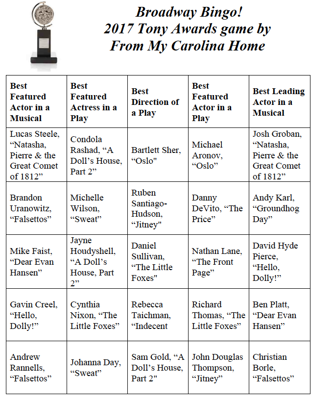 The Broadway Bingo download is still available. It took four hours to create, and I’d love to have a few more take advantage of the free game download. You don’t have to watch the awards to play, it will work just as well with a list of winners from the newspaper. Click on 2017 Broadway Bingo. Family friendly fun.