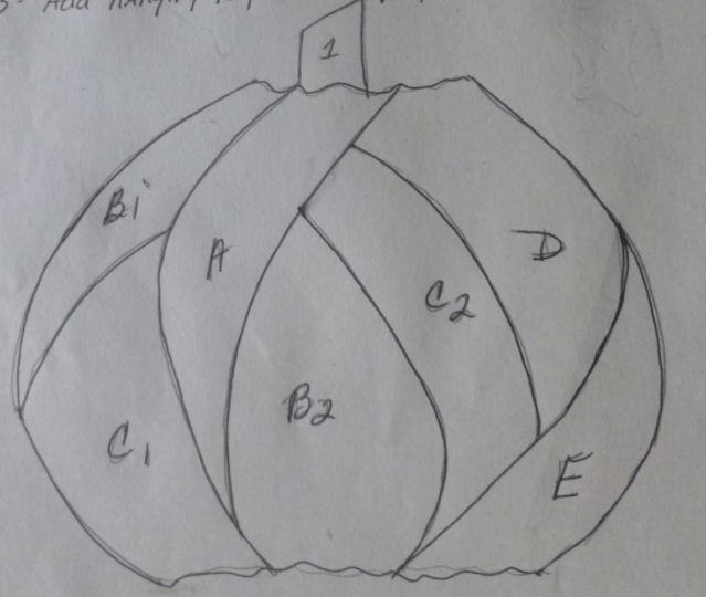 The second page of the pattern has the pieces individually, with some dotted lines indicating the overlap area, which goes behind the next piece. Work the pumpkin in order starting with the stem, adding piece A then B1, then B2, and so on. Pieces marked B1 and B2 are the same wool color, as are the two C pieces. This means you need five colors for your pumpkin to do it like mine. But feel free to duplicate colors however you like. You could use browns or whites if you like.