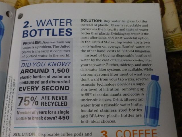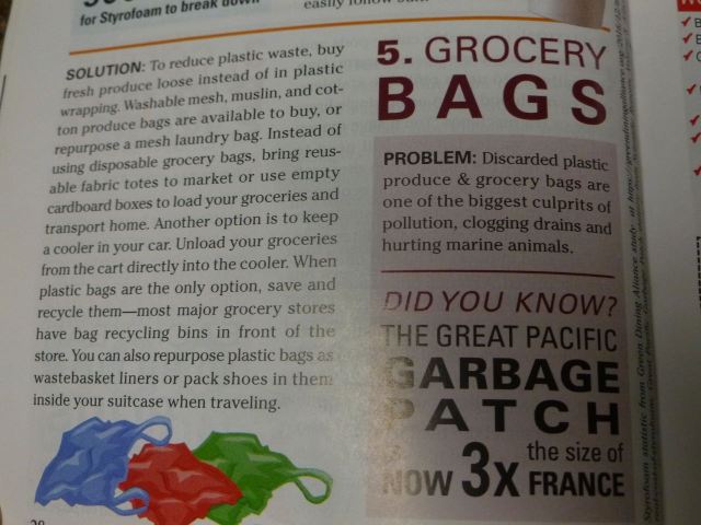 My daughter is a marine biologist so I get regular lectures about all my bad habits and have made a lot of changes. I get paper bags when available and always carry my reusable grocery bins so usually don’t need bags at all. I drink tap water from a Brita, and buy fluids in cartons or glass jars when that’s an option. I use my composter for all table scraps and put the compost on the gardens in the spring. When we rarely need to eat fast food, we get a hamburger at Wendy’s because they have paper straws and paper food containers.