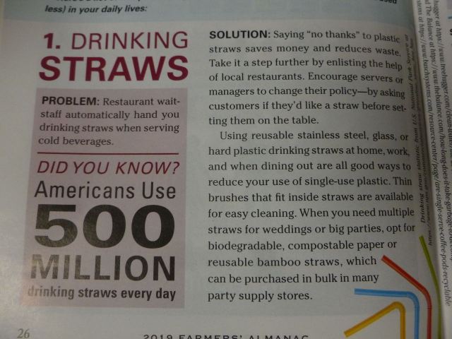 Making An Impact, something we can all do. While having lunch last month with a group of friends, I was once again appalled at the server who set down our water glasses, then haphazardly tossed eight straws on the table for five people. I immediately grabbed the one closest to me, and said loudly to get her attention “PLEASE don’t just drop these on the table, ask if the customer wants one.” Whereupon one of my friends said behind her hand to the server in a stage whisper loud enough for the whole restaurant to hear “just ignore her.” I get it, she believes that one person not using a straw will not make a difference. And, you know, she is right. Only one person doing one thing won’t make a dent in the avalanche of plastic in our oceans and landfills, but a lot of ‘one persons’ can be a force for real change. Even my new Farmer’s Almanac for 2019 is taking up the cause!