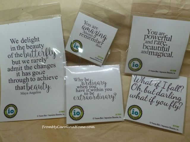Third, once again I want to include special handmade cards with inspirational messages in each bag, so I need my stamping readers to make cards again. In my mind, and the counselors at Safelight agree, the cards are really the most important part of the gift. The cards provide encouragement and support as these women (and sometimes men) take a big step to getting their lives back. The cards can be read over and over as residents need lifting of their spirits. To get us started, I ordered these wonderful stamps from my new affiliate Impression Obsession, Inc. I was very pleased with the quality of these stamps, and they have a nice price point if you get the cling mount or unmounted to use with acrylic blocks or your Stamping Platform. They can be as creative as you like, from very ornate to clean and simple, whatever you like. You may use whatever stamps you like, but I hope you’ll look at Impression Obsession’s offerings. Inside, the message should be one of encouragement.