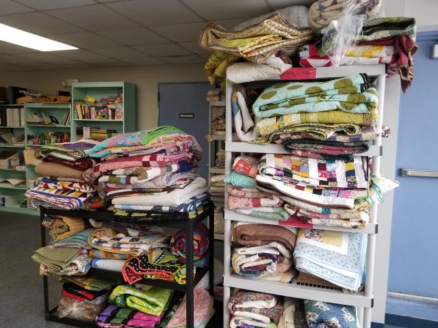 Final drop site dates for the North Carolina shops have been posted on the FAQ page. If you are mailing a quilt to Wilmington, they will take them through 2020. Jo-El emailed me just yesterday with this information – “Today, we received 3 boxes of quilts from Cindy Gardner in Delta, Utah that contained a total of 11 completed quilts! To date, we’ve received 324 quilts for the Carolina Hurricane Quilt Project and 22 quilts for Hands 2 Help, for a total of 346. We haven’t had many survivors return to their homes in the past few months, as apartment complexes that are being repaired are pushing back the move in dates and we’ve had one complex experience a fire. As we approach the one year anniversary of Florence, we hope to see more survivors rehoused. We appreciate all the efforts that went into the creation of these quilts and organization of the project ” She sent a photo of her shelves so you could see some of the quilts that have been received. With what she has, and what I have left to send, our total is now 427!