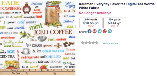 Start looking for your filler fabric, or select something from your stash that will go with the blocks you’ve made. This fabric will be used to fill in the spaces left between the blocks. I wanted something similar to this, with tea words, but it is not available anywhere.