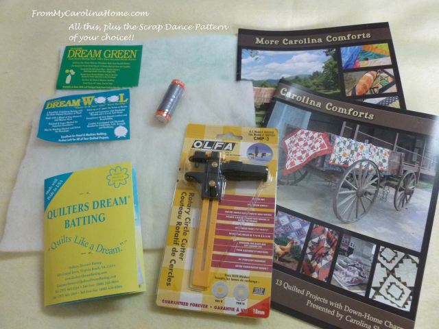 I am also providing one of the Row Along prizes for the event, two pattern booklets of quilts from our local shop hop shops, Carolina Comforts and More Carolina Comforts, a couple of samples of Quilter’s Dream Batting, an Olfa circle cutter attachment for your rotary cutter, and a spool of Aurifil thread, along with a pdf emailed to you of the Scrap Dance pattern of your choice!