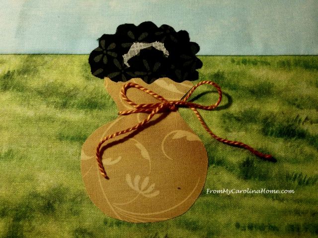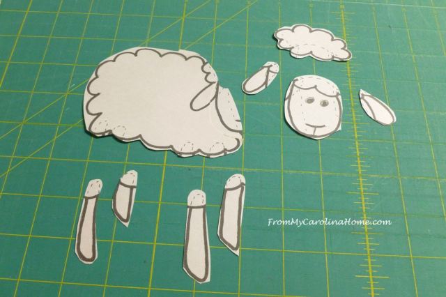 The row is all appliqué, and can be done in whatever method you choose. I used raw edge appliqué. Begin the appliqué section by making multiple copies of the sheep appliqué pattern so you can cut out the parts with their extras as noted with the dotted lines for overlap.