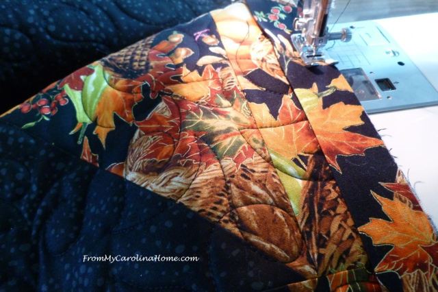 For the Harvest Star runner, I added only one border 2-1/2-inches wide. Quilt as desired. I used a leaf pantograph to blend with the Harvest theme. The project is small enough to quilt on a domestic machine. Stitch in the ditch and free motion quilting are just a couple of ideas.