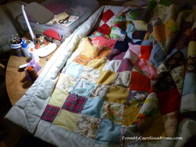 On my basement work table, the handwork quilt repair that will take weeks to finish. I can’t work on it that long at any one time. The repair is tedious and I just get tired of working on it after a bit.