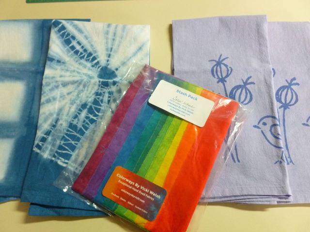 My friend Vicky Welsh has sent me some of her fabulous hand dyed products for prizes!! The Grand Prize will be her Color Wheel Stash Pack, all fat eighths, a rainbow of hand dyed beauty. Runner Up prizes will be two of her Shirbori Hand Dyed Dish Towels in either Blue or Lavender. See her website at Colorways by Vicky, visit her store, and see her lovely blog too.