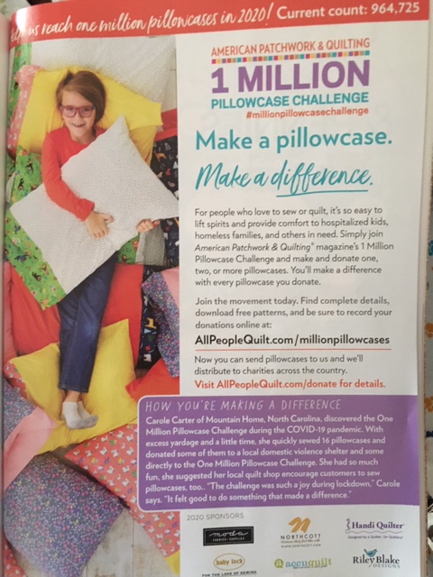 PS – Yes, this is my quote for the One Million Pillowcase Challenge in the purple box on the All People Quilt ad in Quilts and More!! It will be in American Patchwork and Quilting in October. No, I have no idea who is in the picture, that wasn’t mine.