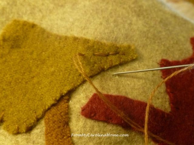 Stitch the leaves to the base using the stitch you prefer. I use a whip stitch with a single wool thread. You can use more threads, different threads, a blanket stitch, whatever pleases you. For a country look, use black threads and a blanket stitch.