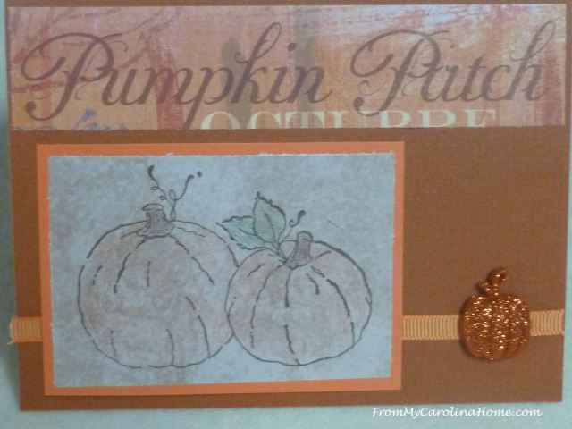 For this card, I used the Pumpkin Pair stamp in brown ink and colored it with pencils and mounted it on an orange card stock frame. A ribbon was glued across the bottom of the rust color base, and a decorative paper with the words Pumpkin Patch was glued across the top. A glittery pumpkin dimensional embellishment is added to finish.