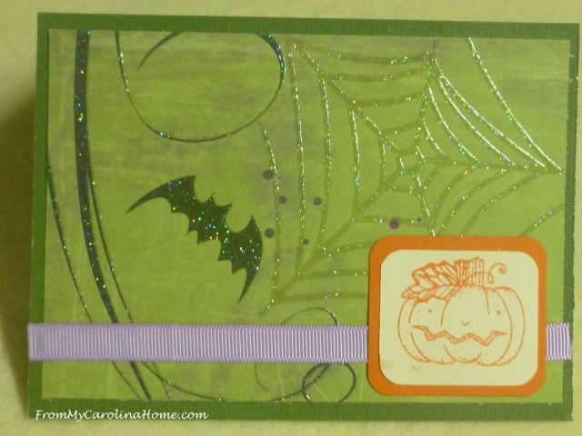 I found this fun paper in my stash for Halloween with a glittery bat and spider web. I added some purple ribbon, and a Jack-O-Lantern stamp from that same set.