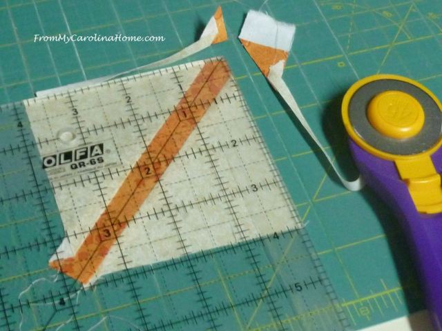 Start by making the stem, using the leaf fabric strip and one of the 4-inch background squares. Cut the square in half diagonally, and place on either side of the strip. Sew and press, then square up to 3-1/2-inches. Do five stems, one in each color.