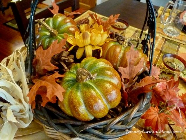 A basket with a leaf design handle anchors the centerpiece, offset to one side to take up the space of two place settings.
