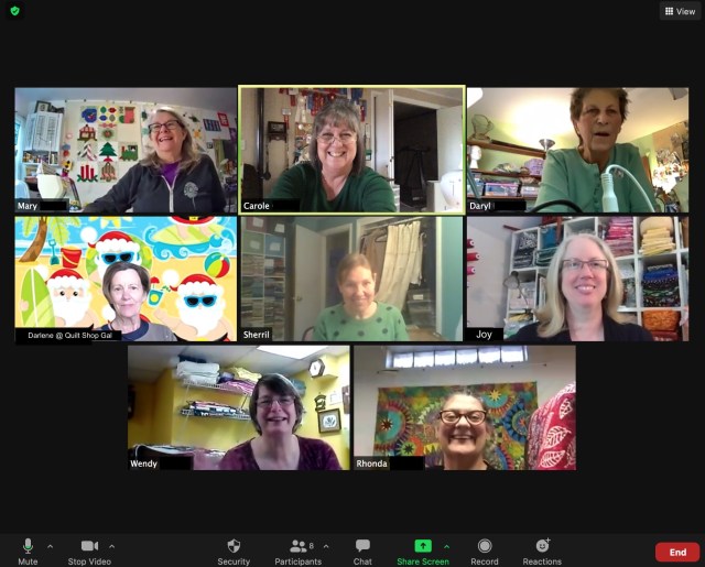 Finding ways to have some fun these days is more of a challenge. When you cannot have sew days with friends at home, or retreats in lovely Victorian homes over a weekend, then next best thing is a sew day at home with friends attending online. The wonderful thing is this would not be possible without the internet. Eight of us attended an all day sewing marathon last Saturday from all over the US and Canada! Three of us live in North Carolina, but we don’t live near enough to be in the same guild. Then we had four more states plus British Columbia, Canada represented!! Four time zones meant early starts for those in the west, but we waited to do show and tell until we all were online.