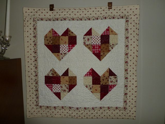 The hearts table topper is so pretty. I am busy making dresses for my 5 Great Granddaughters so no time for quilting.