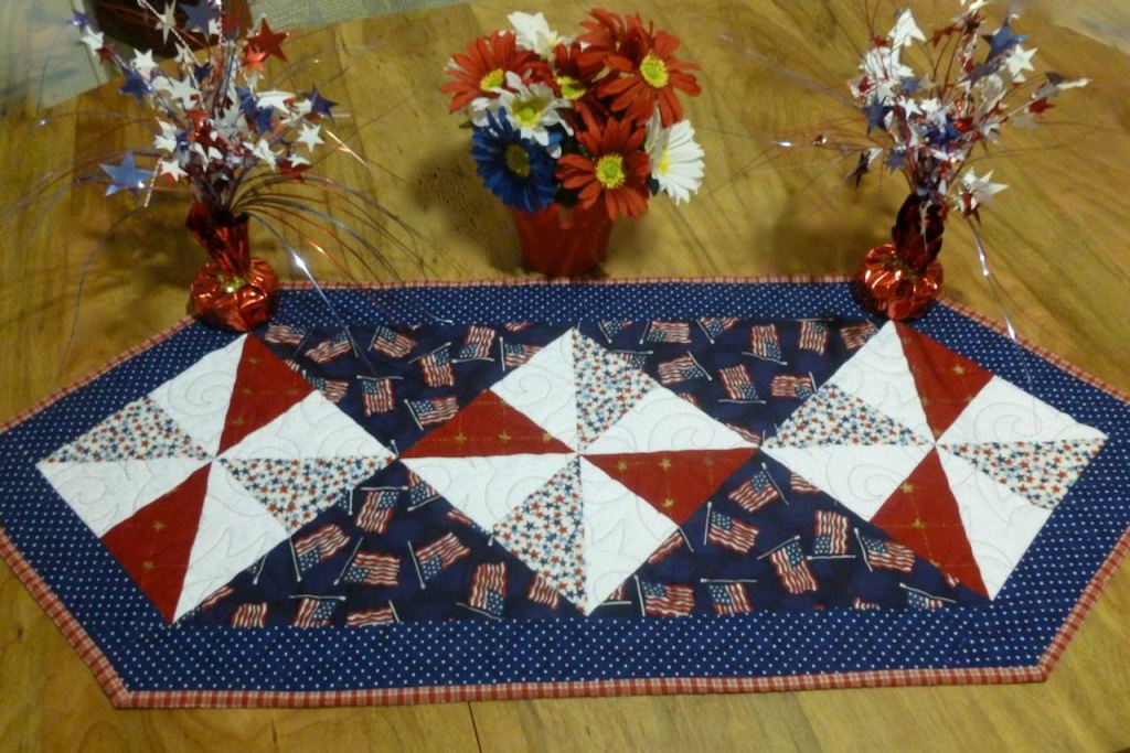 Make my Patriotic Table Runner with TriRecs rulers. Make three stars, then use a patriotic print to expand the size.