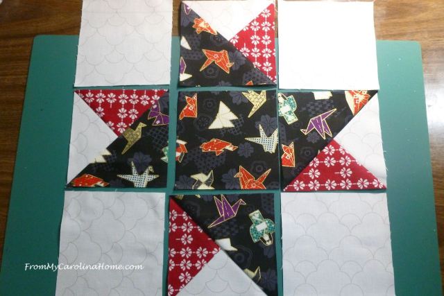 In a bit of free time waiting to start cooking, I piddled around with my Japanese fabrics. I made a single block just to see how they would look.