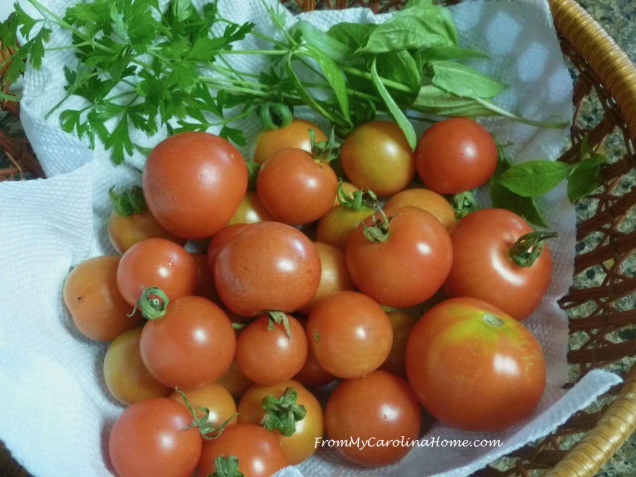 Back home, I’m still harvesting loads of tomatoes. This was a one day haul earlier in the week. This time I picked some fresh parsley and basil to do my roasted tomatoes.