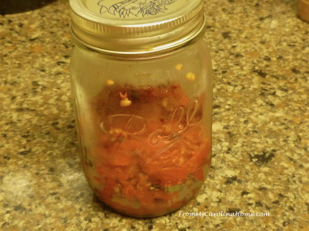 A full sheet pan, loaded with tomatoes, roasted for several hours, dehydrated down to just a half of a jar’s worth. I added the basil and parsley, then covered the top with garlic infused olive oil. This will be a pizza topping later in the week.
