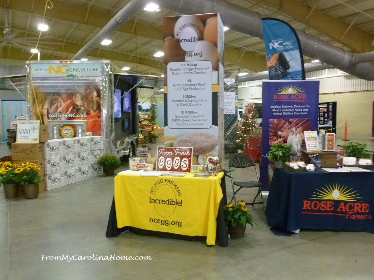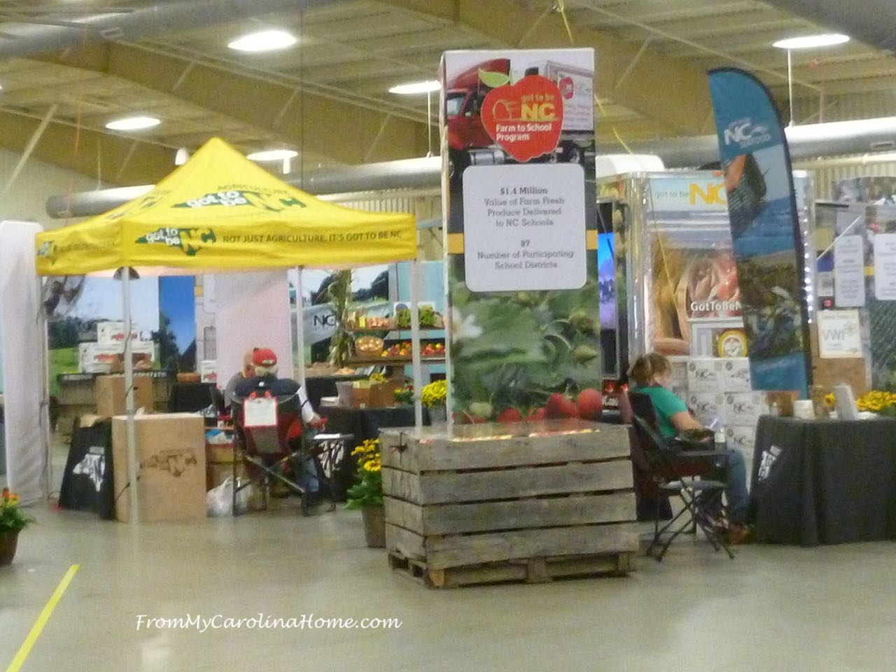 So we walked around a different section of the fair each night, seeing the livestock including the newborn calves,baby pigs goats and tiny chicks, looking for my entries in the expo building, enjoying a music show, watching the human cannonball get shot out of a cannon to a net, seeing the bird show of fabulous exotic trained birds, and walking around the heritage crafts area. Inside the event building, marvelous displays sponsored by NC Agriculture divisions were colorful and inviting.