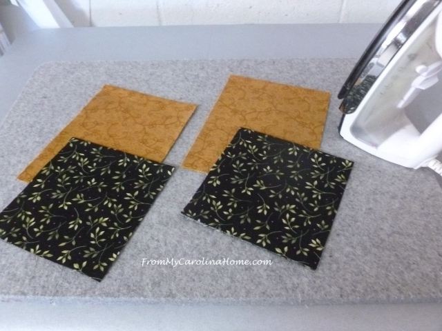 Fold base pieces in half meeting short sides together to get 14-1/2 x 12-1/2 piece. Press fold. Fold inner pocket pieces in half meeting short sides together to get 6-1/2 x 8-1/2 piece. Press fold. Fold outer pocket pieces in half meeting short sides together to get 6-1/2 x 6-1/2 piece. Press fold.